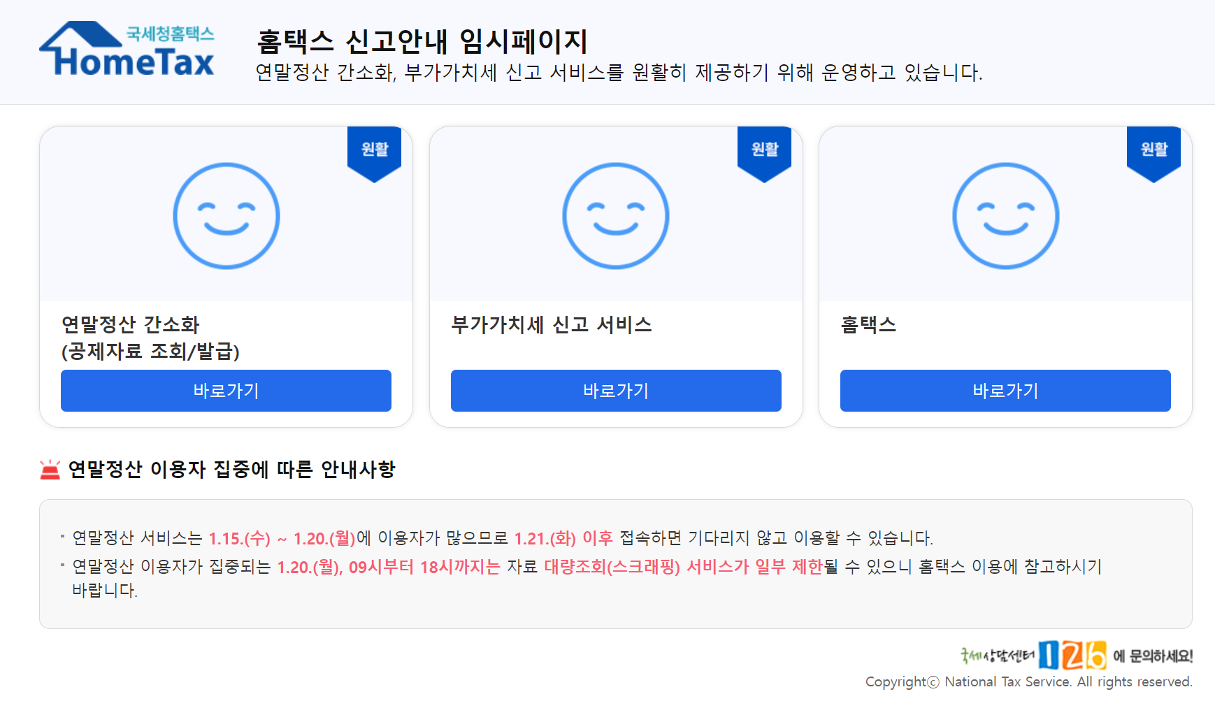 먼저 연말정산 기간에 대해 살펴보겠습니다. 연말정산을 진행하시는 분들은 대부분 연말정산 간소화서비스를 이용하실텐데요. 2025년 1월 15일부터 간소화서비스가 오픈 되어 있어서 현재 홈택스에서 간소화자료를 내려받으실 수 있습니다.